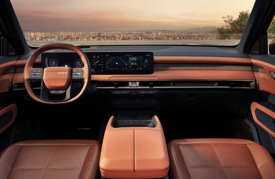 A three-screen dashboard setup dominates the cabin, reminiscent of the design seen in the Kia Syros. This configuration includes a fully digital driver’s display, a central infotainment touchscreen, and an additional co-driver information screen. The 3-spoke steering wheel with the offset Kia logo adds to the futuristic appeal.
