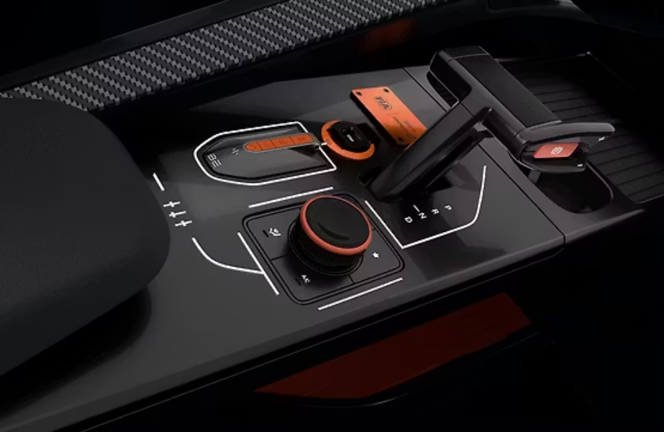 The transparency panels and colour accents give the cabin a futuristic, high-performance feel.